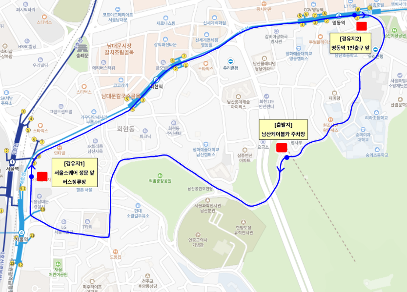 지하철을 이용하시는 분들은 명동역 1번 출구와 서울역 서울스퀘어에서 남산케이블까지 운행하는 셔틀버스를 이용하여 남산케이블카에 쉽게 이동하실 수 있습니다.